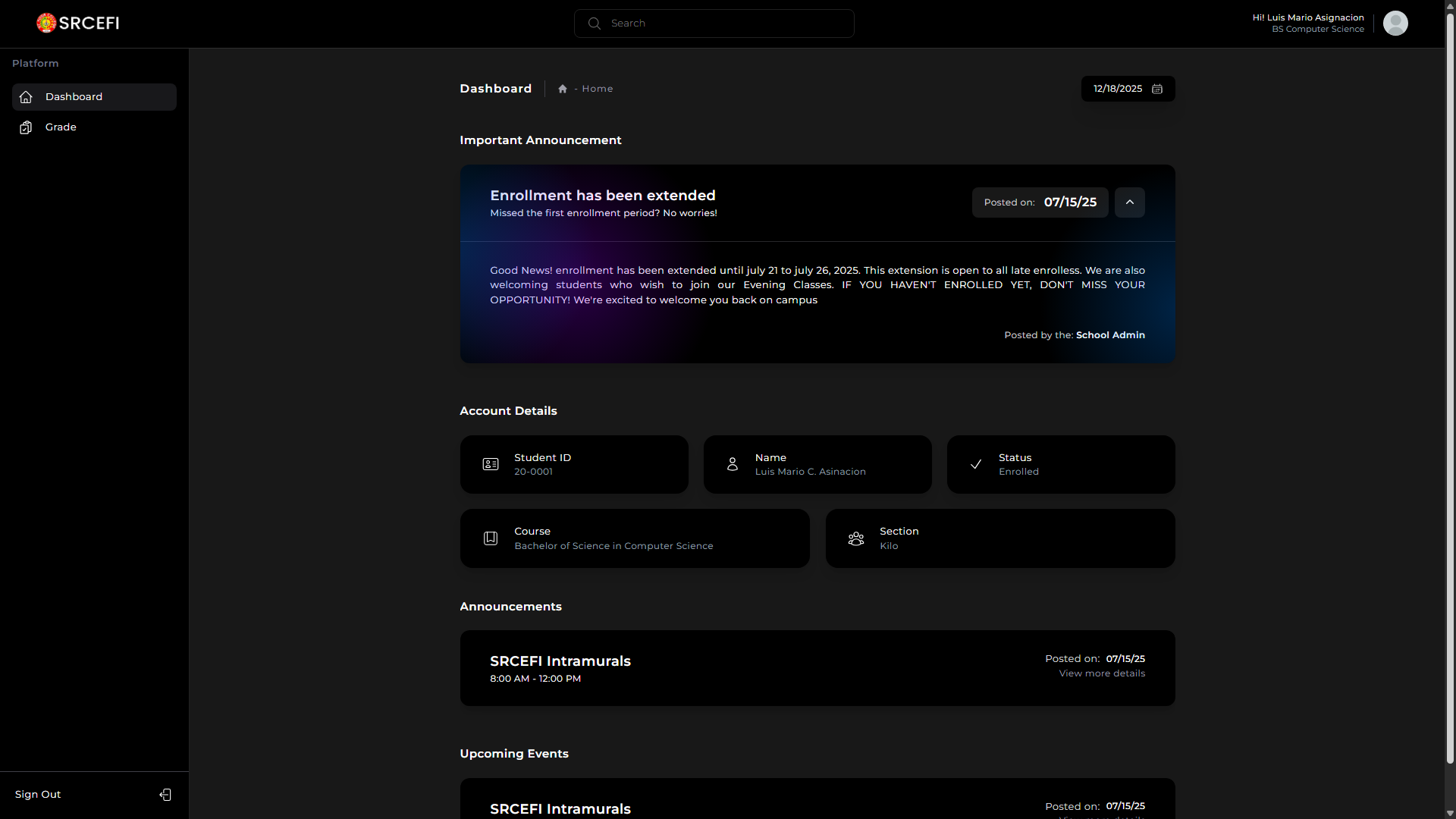 Students can easily monitor their grades, stay updated with school announcements, view upcoming events, and manage their personal profile all through a centralized and user-friendly system.